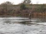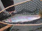I went out yesterday with two buddies. We fished from 9 am to dark. Between the 3 of us there were 5 hook ups and only 1 to hand. We didn't get any action at all until 5 pm. We parked at the hatchery and walked down to the island. There were already 7 guys at the top of the chute next to the island so we went back upstream to the riffles section. We did see a couple of fish hooked by those guys. At lunch we drove down to Sunrise and tried there for a few hours then headed back up to the hatchery with hopes of getting a spot near the chute. Wrong, there were 13 guys there now so we continued to fish the riffles. All fish came on some type of black streamer. I was using a black bunny leech, one buddy was using a black and purple thing with barbell eyes he tied and the other guy was using a big black and purple bugger. I think if the weather was not so nice we could have done better...a cloudy sky would have helped. These are pics from the only fish landed from hook up to net to hand.