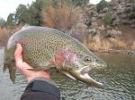 Went to the E. Carson thanksgiving morning for a couple hours. It was cold & the fishing was really slow. I didn't take a temp reading, but the water was much colder than even just a couple weeks ago. I started with a few holes and riffles that I always seem to catch fish in. This time I only managed one 10"er out of all three. Decided to try something different so I looked for the biggest slowest water I could find. Found about a 150' strecth that seemed to have pretty good depth and flowed ever so slowly. It was a little windy so I couldn't spot any fish, but at least they couldn't spot me i thought. Started my drift at the top. About fifty feet downstream after what seemed like a few minutes, I was thinking damn this is boring I'm done for the day when all of a sudden I saw a huge flash and my indicator dove down. Set the hook and my reel started screaming. Long story short ended up getting my butt kicked by this fish for a little while, before I was able to finally land it. I didn't have a net so I was freaked out the entire time. I marked it on my rod, took a couple pics, and sent it on its way. Figured it was between 25.5"-26.5".