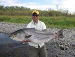 Fish Story: I had a really crazy experience happen to me in late September. I had a client land a 40lb striper on a rubber leg while fishing for trout below Red Bluff. Cant believe that we landed this fish on 2X with a size 8 stone fly nymph. Must have just hit the fish on the nose. The fish was 44.5" long with a 29" girth. It was an amazing experience holding this fish and reviving it to let it swim back into the depths. Craziness!!!!