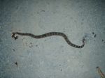 On the way back to my car, as another car was leaving the parking lot, I almost stumbled on a snake:  dark brown with white bands.  Scared the crap out of me.
