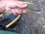 Alistair, for your benefit, I have posted a new leader for smallest fish of the year. Besides how small he is, notice: a) he's caught on a dry b) he's hooked right through the lip. I told the guys that I was going to fish this tiny spill-in in search of a fish smaller than yours. Sure enough, first cast produced a winner. We all laughed. You've got some work to do now.
