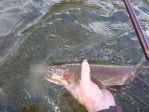 Next morning we drove down to Pit 3.  It was cold and cloudy but the fishing was great.  I hooked up first cast and lost a beautiful fish.  By mid morning the skies had opened again and it pretty much rained constantly the rest of the day.  Thank god for Gore Tex.  By 2:30 we were both borderline hypothermic and we called it quits.  My buddy Kevin had about a dozen fish in hand, whereas I just got 3 but lost at least a dozen.  Only when we were finished fishing I realized I had missed not one but two eyes when I set up mid morning after being broken off.  Hard to set a hook with a rig like that!