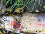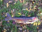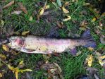 Below are pictures of one of the two 21" adult spawners found dead along the creek bank on Friday. They were found near a major redd area. The one pictured had appeared to have been foul hooked behind the right gill with the line wrapped around both sides of the upper jaw like a bridle and had worn grooves in the jaw. There were line marks along the body as well and the right gill plate was cracked. The condition of the other couldn't be checked before it floated away.